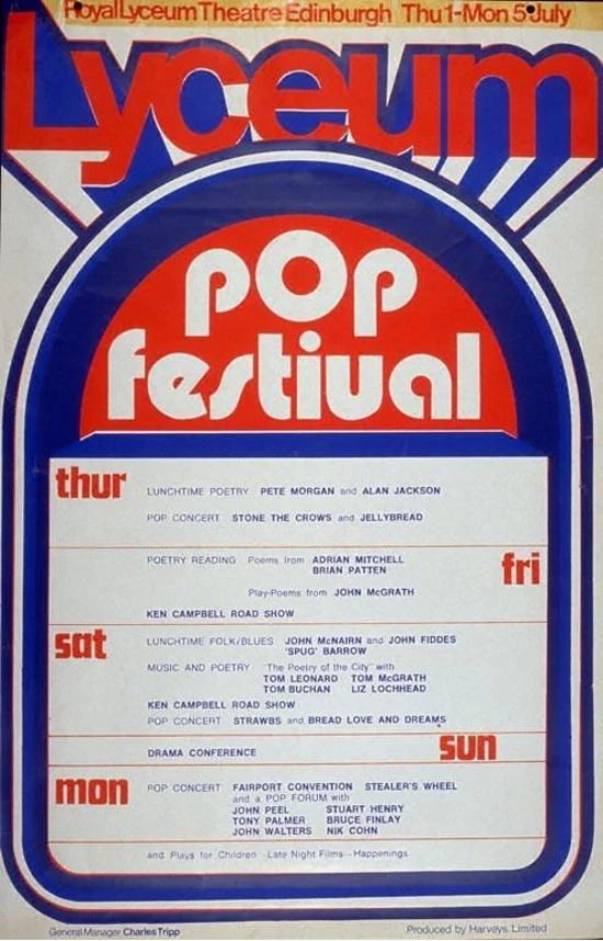 5 Lyceum Theatre Edinburgh: A weekend long "Pop Festival" [8], final night concert (on Monday) featuring Fairport Convention, Stealers Wheel and a 'pop forum'. The forum consisted of John Peel, John Walters, Tony Palmer, Stuart Henry, Nik Cohn, Bruce Findlay