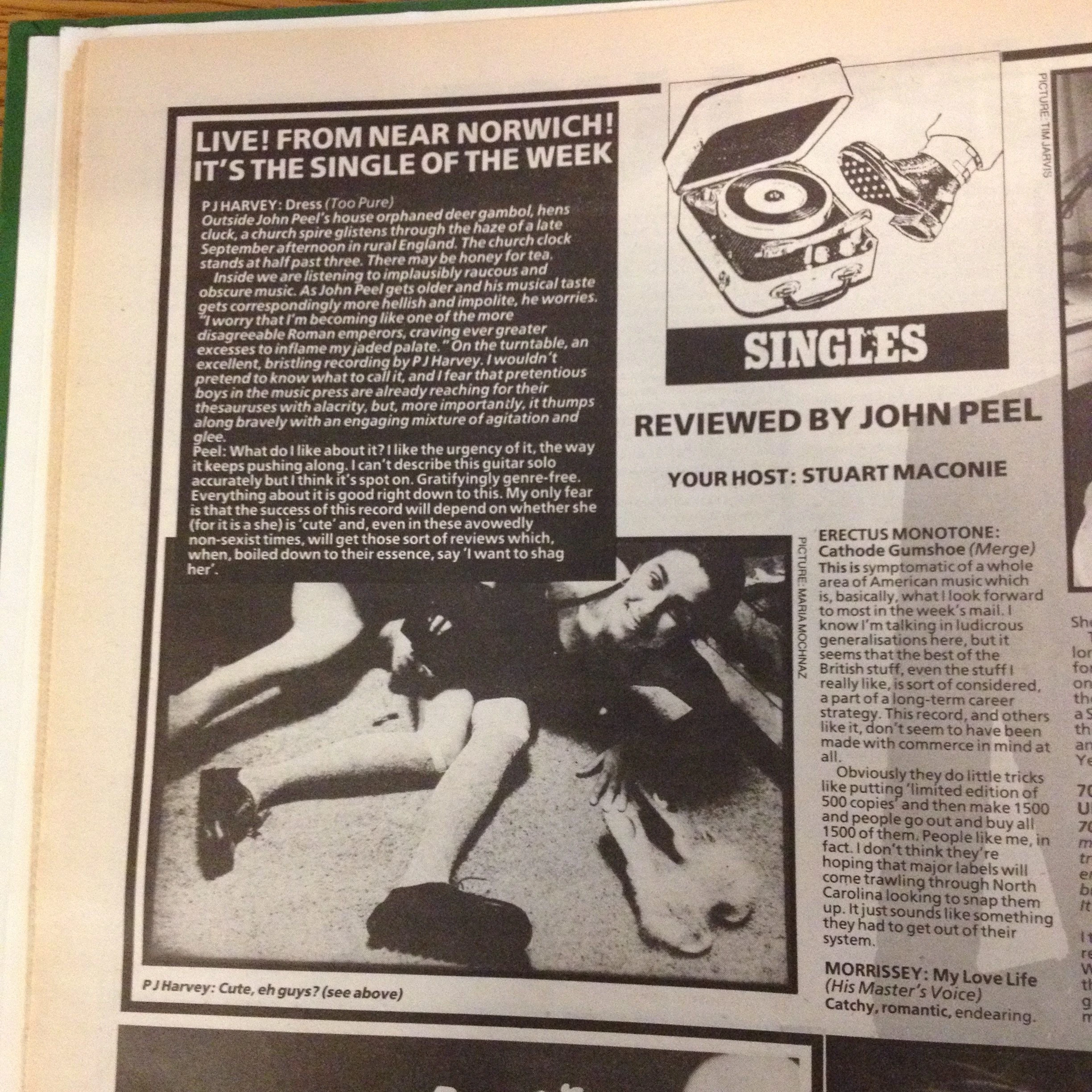 PJ Harvey: Dress (12") Too Pure ("What do I like about it? I like the urgency of it, the way it keeps pushing along. I can't describe this guitar solo accurately but I think it's spot on. Gratifyingly genre-free. Everything about it is good right down to this. My only fear is that the success of this record will depend on whether she is cute and, even in these avowedly non-sexist times, will get those sort of reviews which, when, boiled down to their essence, say I want to shag her")