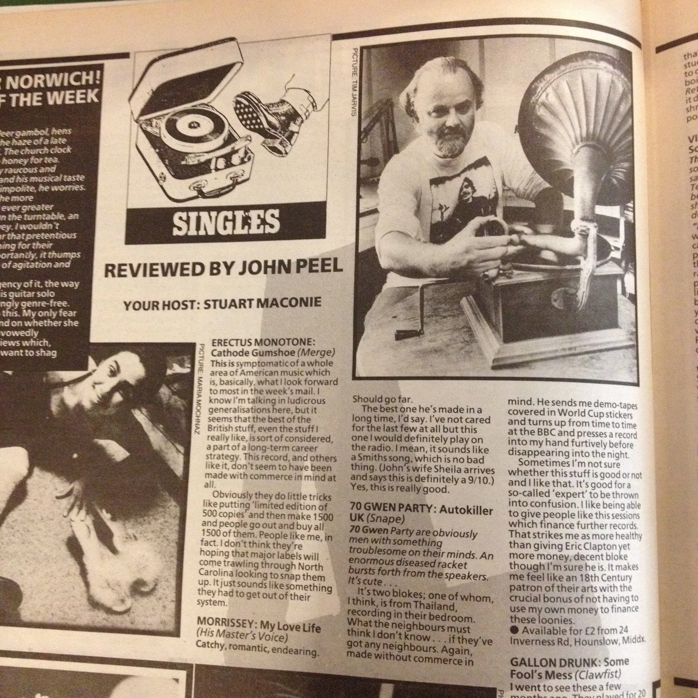 Morrissey: My Love Life (12") His Master's Voice ("The best one he's made in a long time, I'd say. I've not cared for the last few at all but this one I would definitely play on the radio. I mean, it sounds like a Smiths song, which is no bad thing")