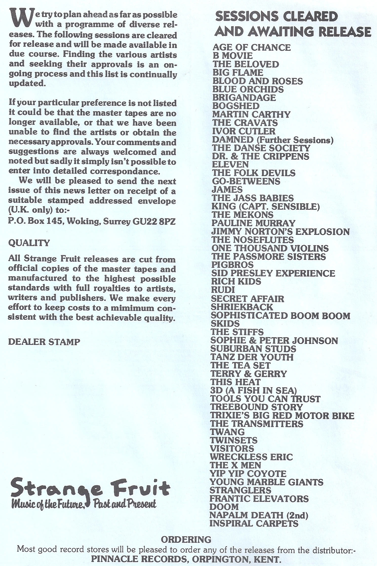 In 1989 a Dealer Sheet was included in some releases that trailed a list of 60 sessions that had been cleared and were awaiting release. Although Strange Fruit continued to release sessions for several more years, very few of the sessions listed appeared.